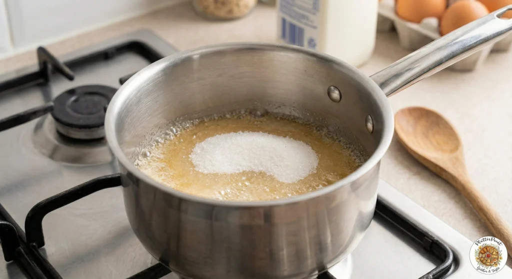 - Heat it gently—don’t stir—until the sugar melts and turns a deep golden color.