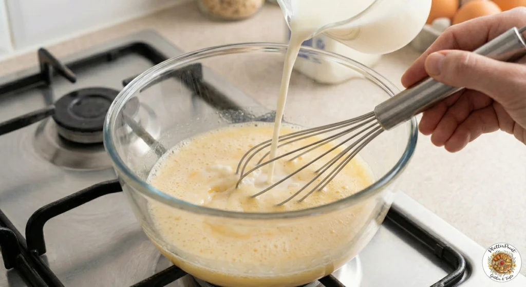 - Slowly pour the warm milk into the egg mixture while stirring gently.